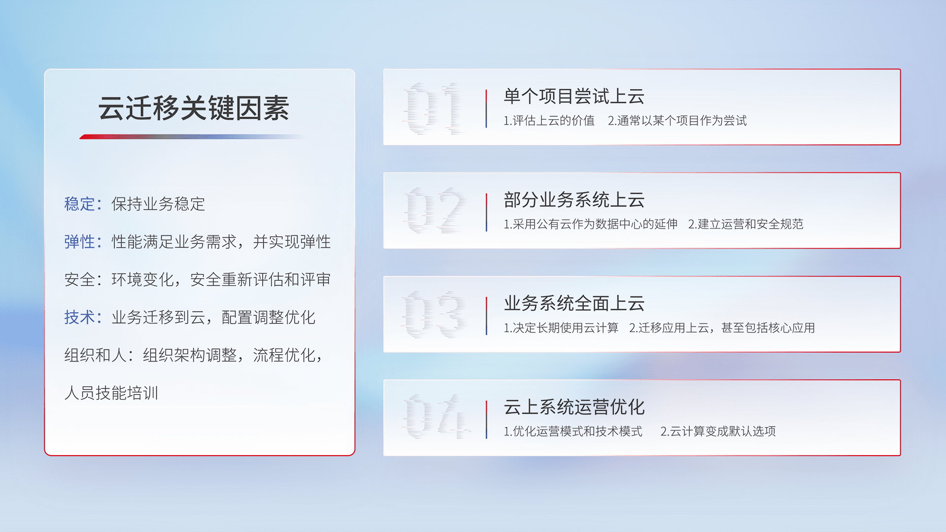 结合实际业务,,,从规划设计、、云平台选型、、云原生改造、、、数据迁移、、、、集成交付,,,迁移全过程为客户识别最佳上云路径,,,,做好风险识别管理,,设计网络架构、、、身份权限、、安全审计合规、、、、操作审计、、、、日志审计、、、、监控告警策略、、多站点容灾设计等,,对云上基础设施进行整体规划,,提升IT治理水平,,以满足弹性、、、、高可用、、、、高性能的需求。。。