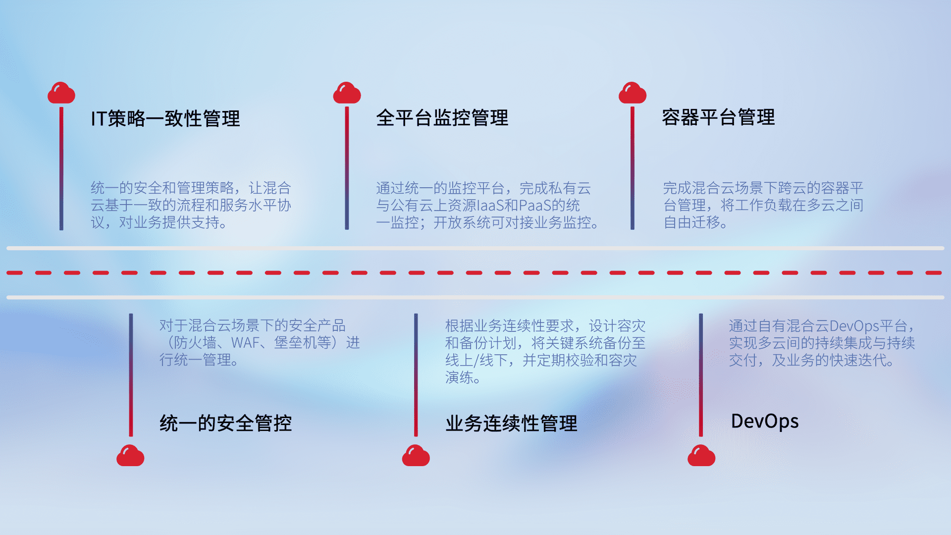 通过多云纳管,,,以统一的资源数据模型把客户的云资源进行抽象和封装,,,,进而实现对多云资源的统一操作,,,,保障云资源管理的可靠性、、、稳定性与可用性。。。量身定制化运维内容,,,配置、、、、开发运维、、、、补丁管理、、、备份、、监控、、、、认证和访问管理、、、审计和日常巡检等,,,,保障在用云过程中的可靠度,,稳定度以及高可用率。。。